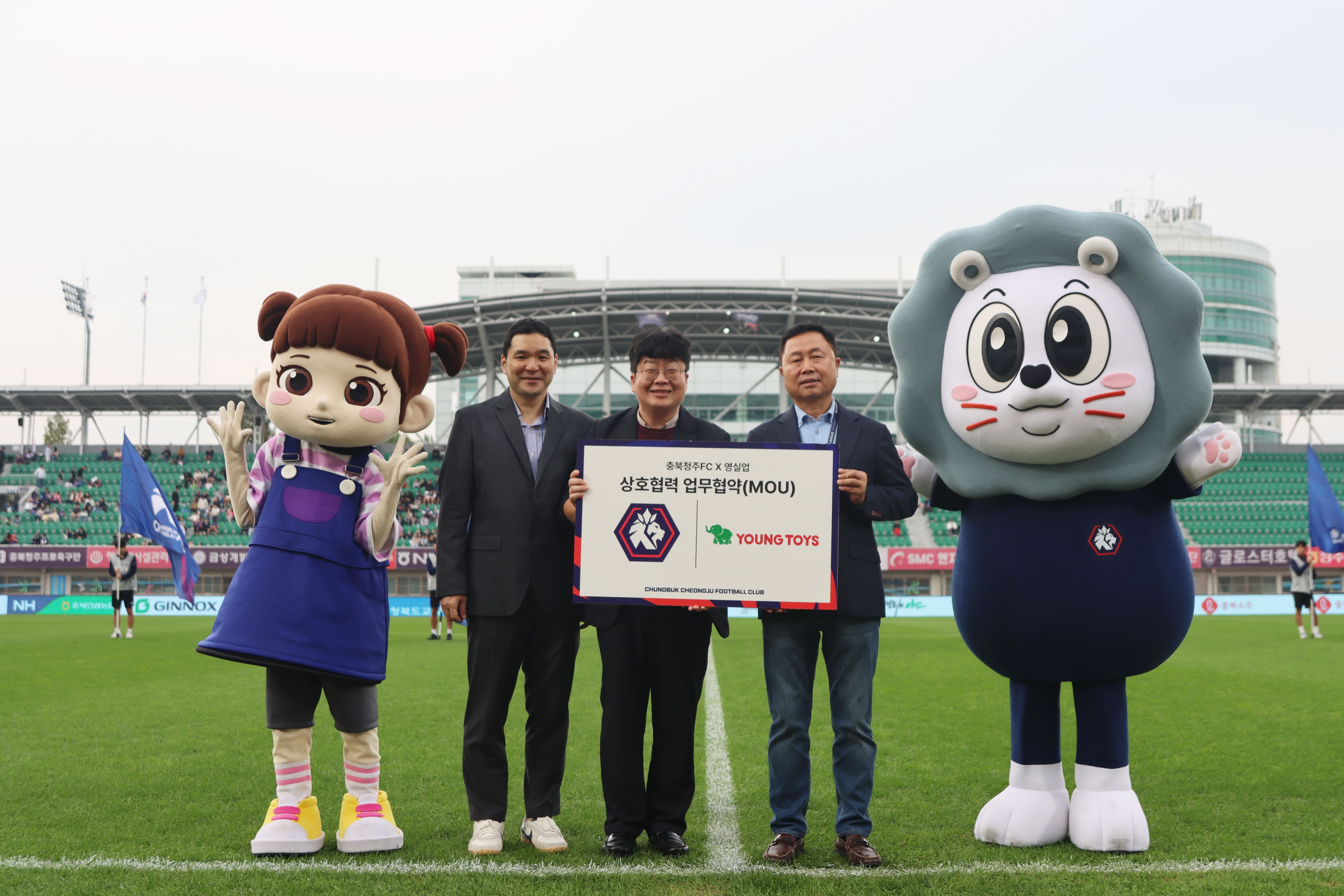 충북청주프로축구단(이하 충북청주FC, 대표이사 김현주)이 10월 19일(일) 청주종합경기장에서 열린 하나은행 K리그2 2025 35라운드 전남드래곤즈전에서 국내 대표 완구기업 ㈜영실업(대표이사 강철구)과 IP(지식재산권) 기반 공동브랜딩 및 마케팅 협력 업무협약(MOU)을 체결했다.