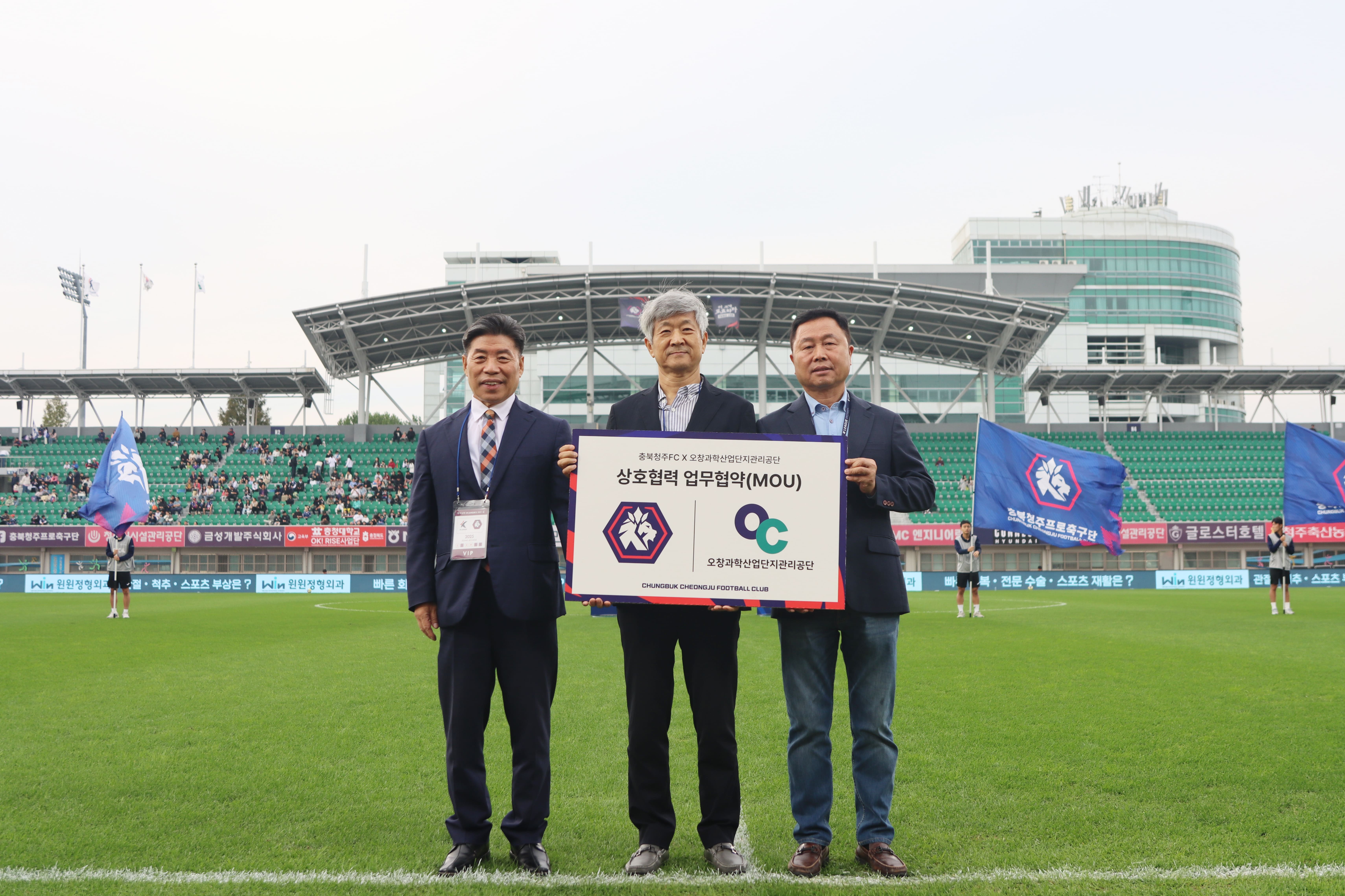 충북청주프로축구단(이하 충북청주FC, 대표이사 김현주)과 오창과학산업단지관리공단(이사장 금만희)은 10월 19일(일) 청주종합경기장에서 양 기관의 상호 발전과 지역 상생을 위한 업무협약을 체결했다.