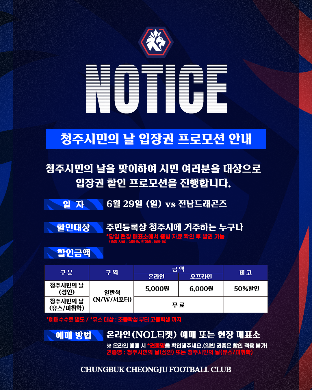 이번 프로모션은 6월 29일(일) 전남드래곤즈와의 홈경기 일반석에 한해 적용되며, 예매 시 수수료는 별도로 부과됩니다. 자세한 내용은 구단 공식 홈페이지와 SNS, 그리고 NOL 티켓을 통해 확인할 수 있습니다.