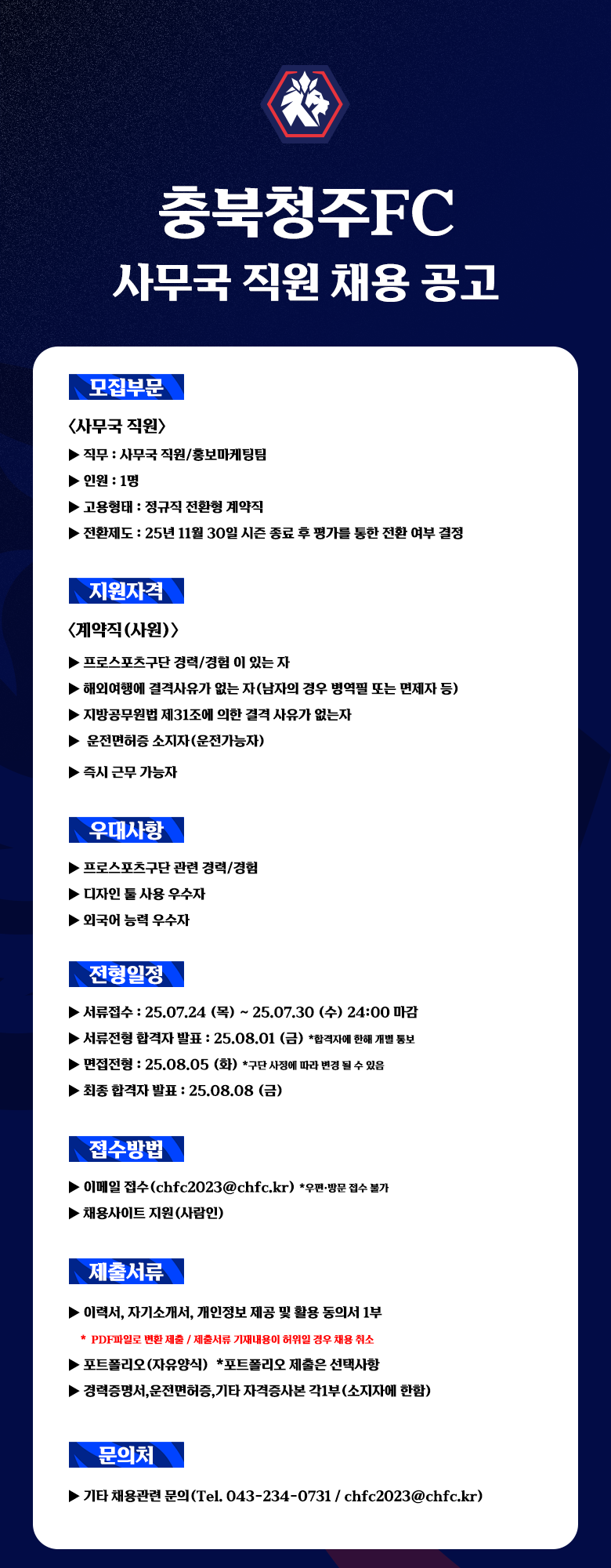 충북청주프로축구단 사무국 직원 채용(계약직)