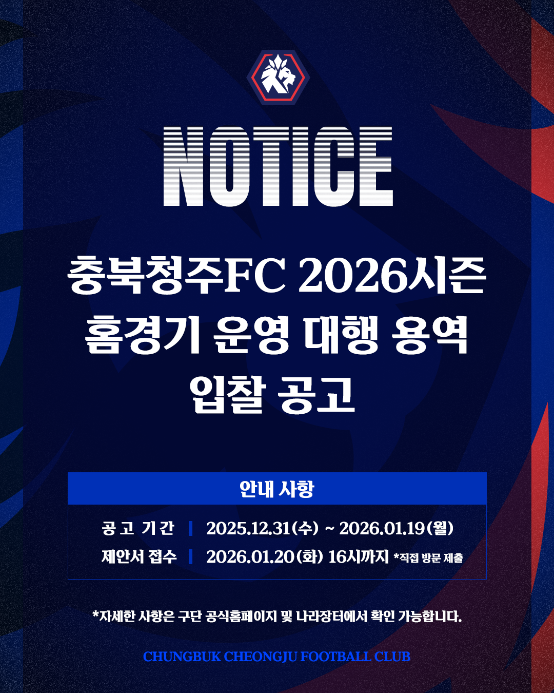 ※ 첨부 내용과 같이 2026시즌 충북청주FC 홈경기 운영 대행 용역 입찰을 공고하오니 많은 관심 바랍니다.